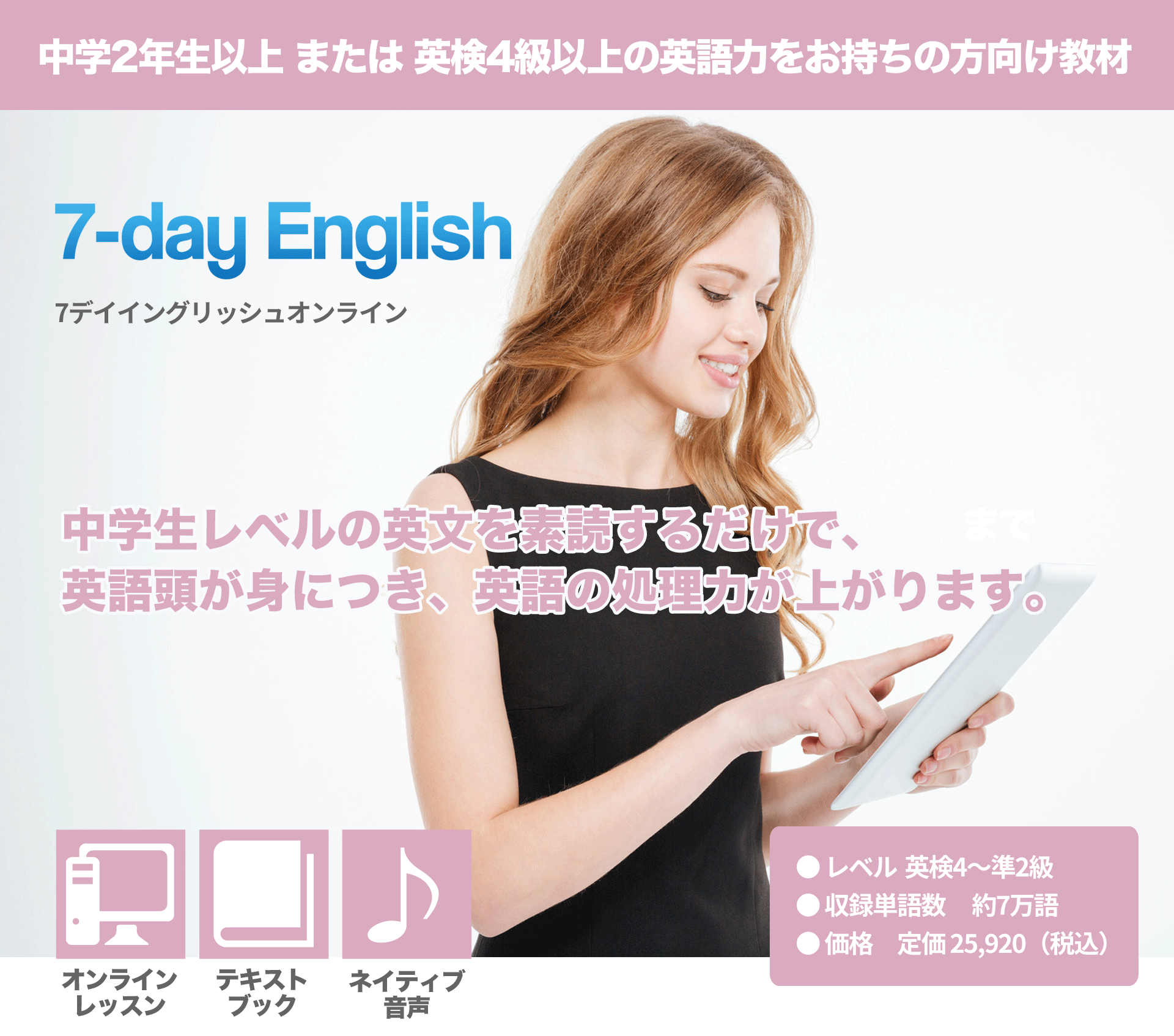 『7-day English』は、中学レベルの英語の文法知識と語彙で十分に読めるような、短く、簡単な語ばかりが使われています。つまり、中学生以上のすべての日本人に適した素読学習用の教材なのです。『7-day English』は、オンラインレッスンで画面に現れる英文を、流れてくる音声と共に読むことで「英文素読」を簡単に実践でき、そしてあなたの脳にも使われることなく放置されている「言語習得プログラム」のスイッチを「オン」にするように作られています。