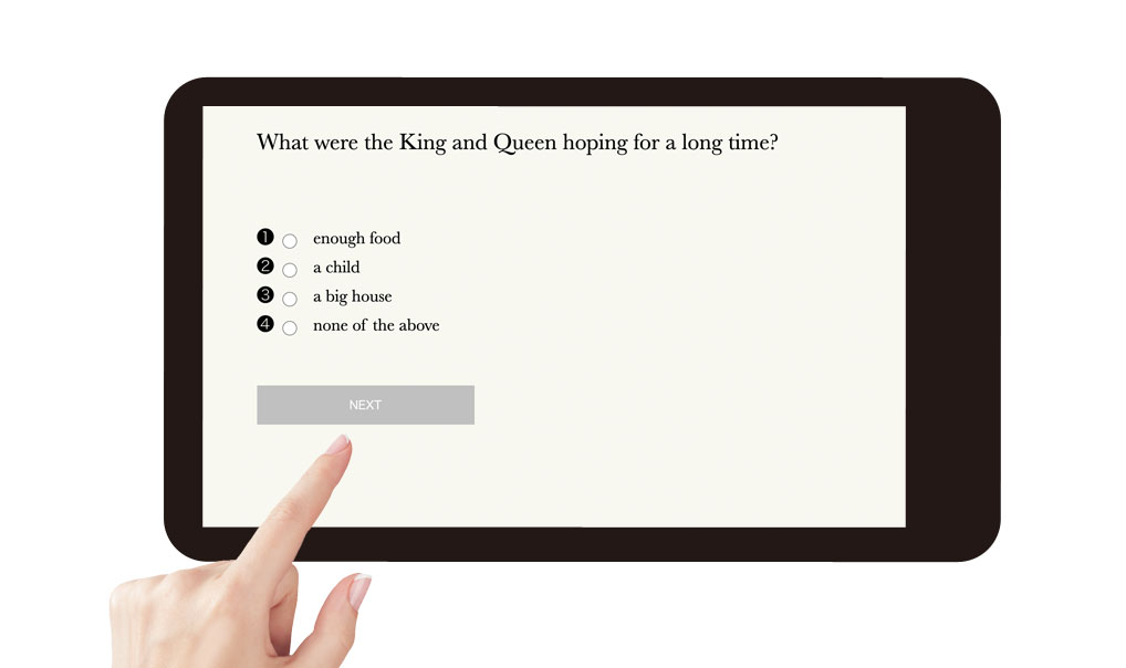 「Story Quiz」は、課題ストーリーの内容を問う問題です。質問に対して正しい答えを2択で答えます。最初はリーディングに夢中で内容理解までいかない方でも、素読を続けるうちに余裕が出て、少しずつ大意を把握しながら読めるようになります。「Story Quiz」の成績で、ご自身の理解力を確認していただけます。問題数は合計288問です。