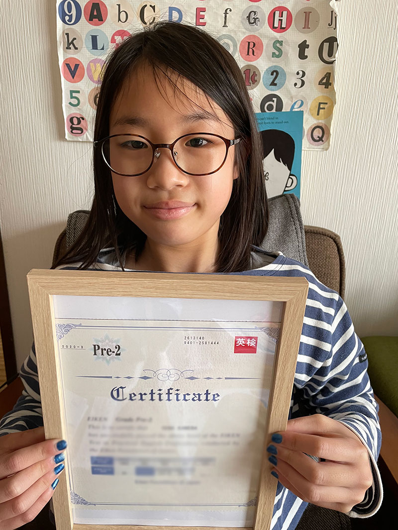 小さい時から掛け流しや読み聞かせのみで育てて、塾など一切通わずにやってきたのですが、3級まではそこまで勉強という勉強をしなくても本人は理解していましたが、3級から準二級のハードルがとても高く、普段使わない単語、日本語にしても難しい単語等あり勉強という感じでさせなければならず本人もだんだん嫌になってきているのが分かりなんとかしなければと言う思いでオンラインレッスンを始めました。オンラインレッスンとダウンロードの練習問題、ライティングを中心に取り組みました。それでも難しい感じがあり不安でしたが、なんとか合格し、リスニングはたった一問間違えただけでした。