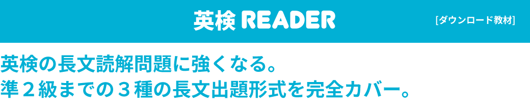 英検の準2級、3級、4級の「掲示板」「Eメール」「長文読解」と3種類の出題形式を完全カバー! 学校集会の掲示板やキャンプのお誘いメールなど一般的なトピックから、マイケル・ジャクソンについての長文読解など時節のものまで、英検の出題傾向に合わせたオリジナルストーリーで英検対策準備ができます。 英検Reader 教材仕様 テキスト[PDF形式/36P] 音声[MP3形式/72ファイル]