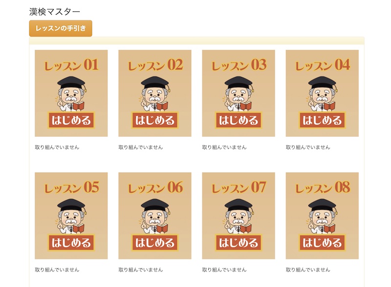 全80レッスン終了後は、会員期限内であれば80レッスンから任意で好きなレッスンを選んで何度でも復習していただけます。レッスン終了後は各レッスンの入口に直近の正答率が表示されています。すべて80%以上を目標に頑張りましょう。反復学習を何度も行い、最終的に当該級に対応するすべての漢字を読めるようにしましょう。