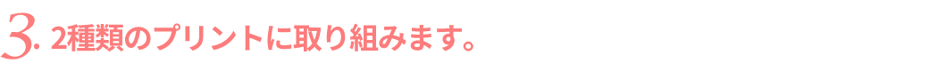 かけ流し、オンラインレッスン、DVDで学習した内容をさらに定着に結びつけるプリントに取り組みます。プリントはオンラインレッスンの内容を復習できる「レッスンプリント」とパルキッズプリスクーラーで学んだ単語を書く「単語練習プリント」の2種類に取り組みます。