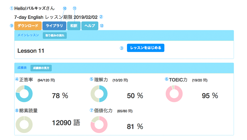 レッスンを行うユーザーの名前です。「レッスン開始手続き」を行ったお子様のご登録名が表示されます。