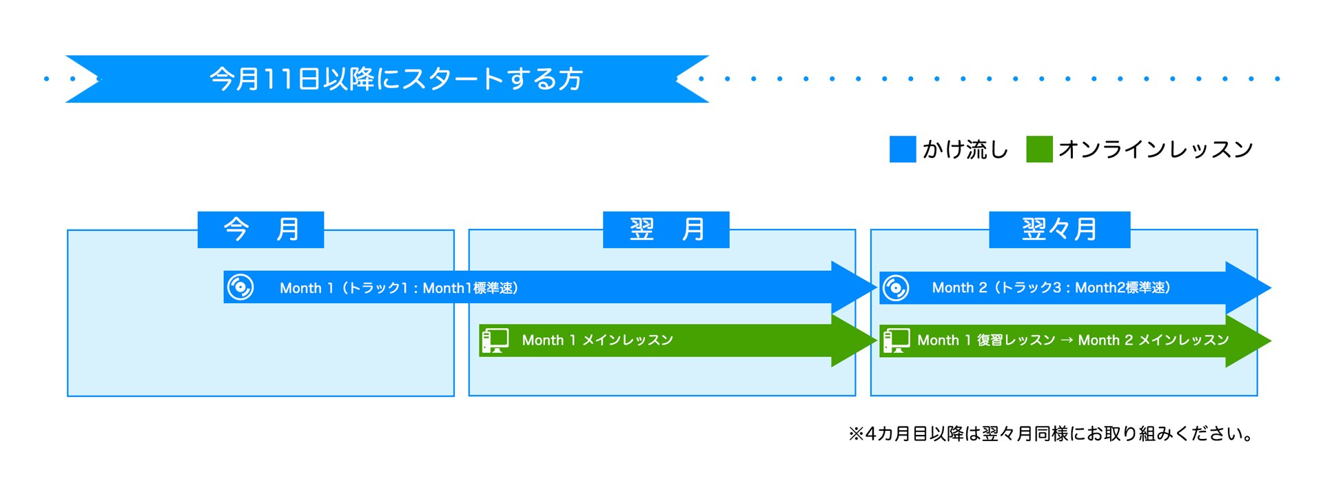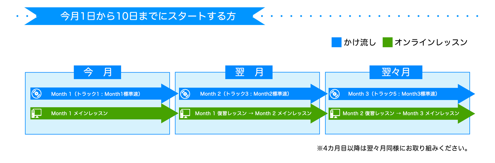 オンラインレッスンも月4冊のペースでレッスンが進んでいきます。該当月の絵本から構成される「メインレッスン」が月20レッスン、前月に取り組んだ絵本で構成される「ふくしゅうレッスン」が月10レッスンあります。