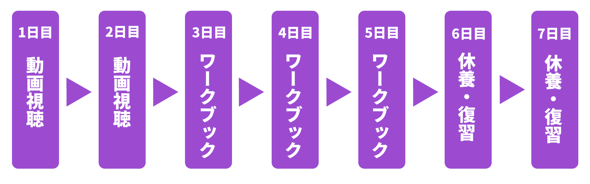 ワークブックはPDFデータでダウンロードでご提供しております。プリントアウトをしてご利用ください。ワークブックは付属の音声を使って取り組みます。音声はワークブックページ内のQRコードをスマートフォンで読み取って再生してください(音声を聞くにはログインが必要です)。取り組みペースの目安は週6ページです。1ヶ月(4週)で合計24ページに取り組みましょう。