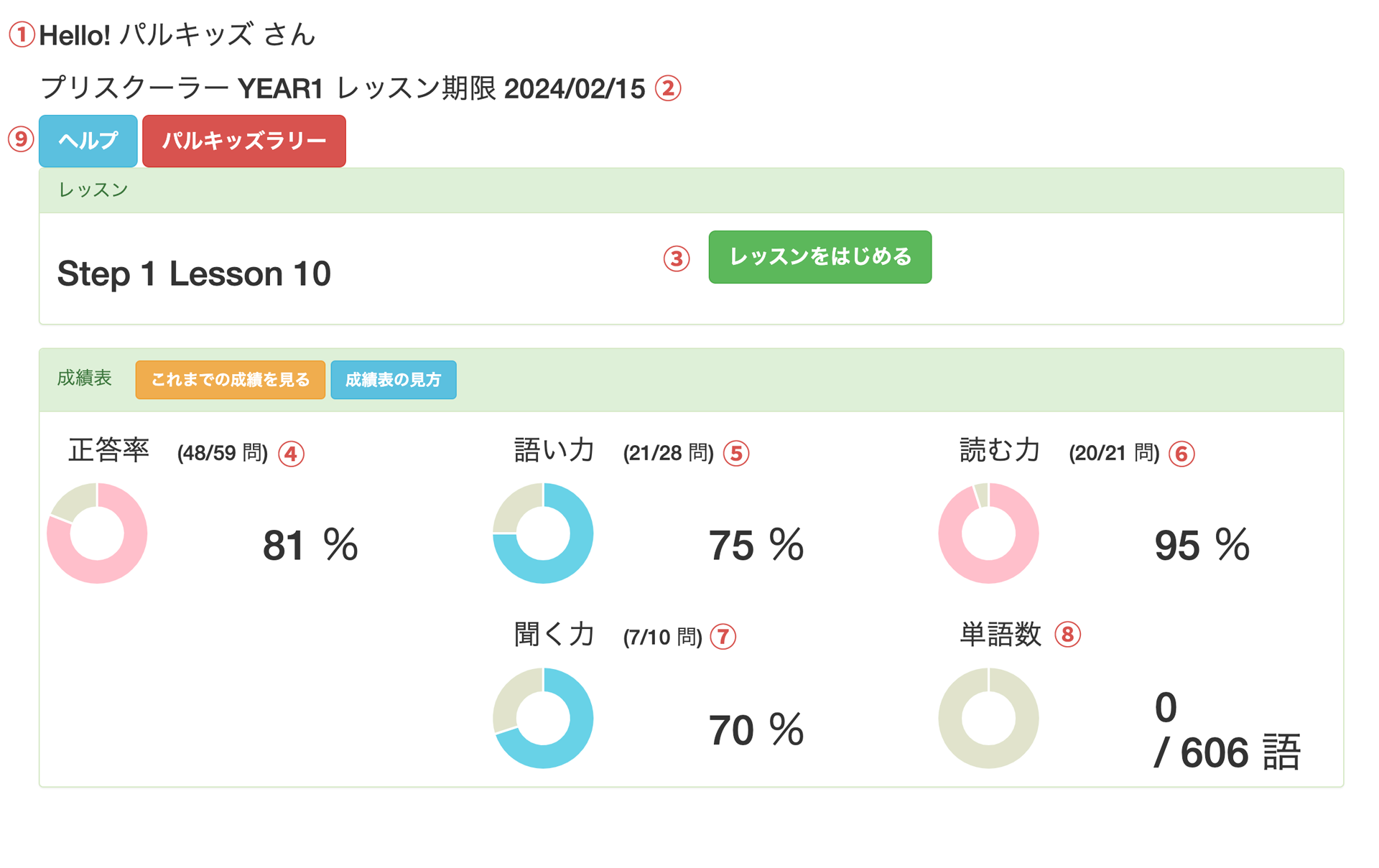 「Word Quiz」「Story Quiz」を合計した、現在取り組んでいる1ステップ分の正答率です。ステップが変わるとリセットされます。正答率が80%以上の場合はグラフがピンク色になります。