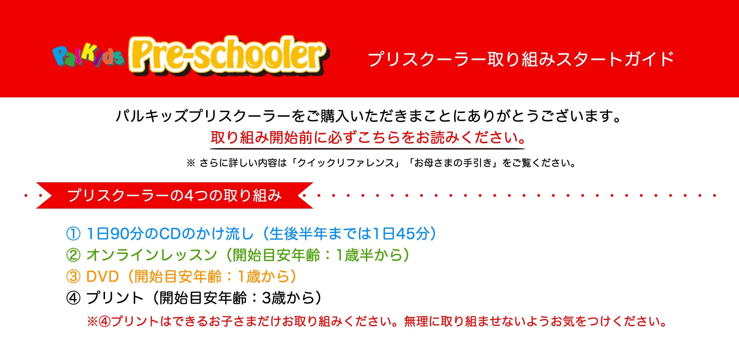 パルキッズ(今回はパルキッズプリスクーラーを例にとってお話を進めます)の取り組み方はシンプルです。1)1日90分のかけ流し、2)1日3~5分のオンラインレッスン、3)月の後半に見るDVD、そこにプラスして取り組める子は4)任意でプリントに取り組みます。ですから必須の学習は1)~3)の取り組みになります。