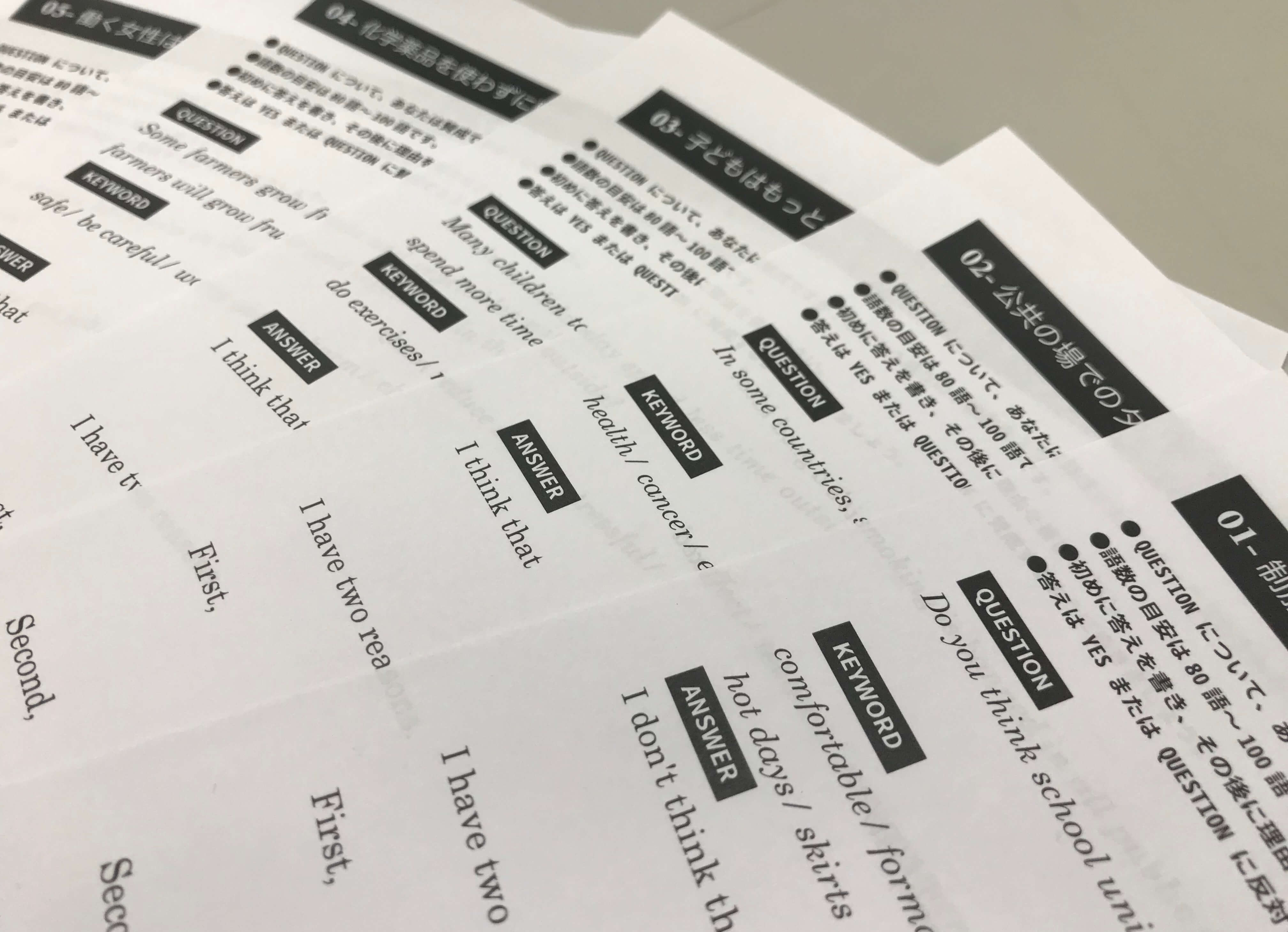 そして今回、新たに導入したのが「ライティング対策プリント」です。3級、準2級でも始まったライティング問題に対して、全30のトピックに対して、60の回答を用意することで、確実にライティング問題で点数を稼げるようにしていきます。これだけのボリュームで、さらに小学生でも取り組めるライティング対策問題は、他にはありません。