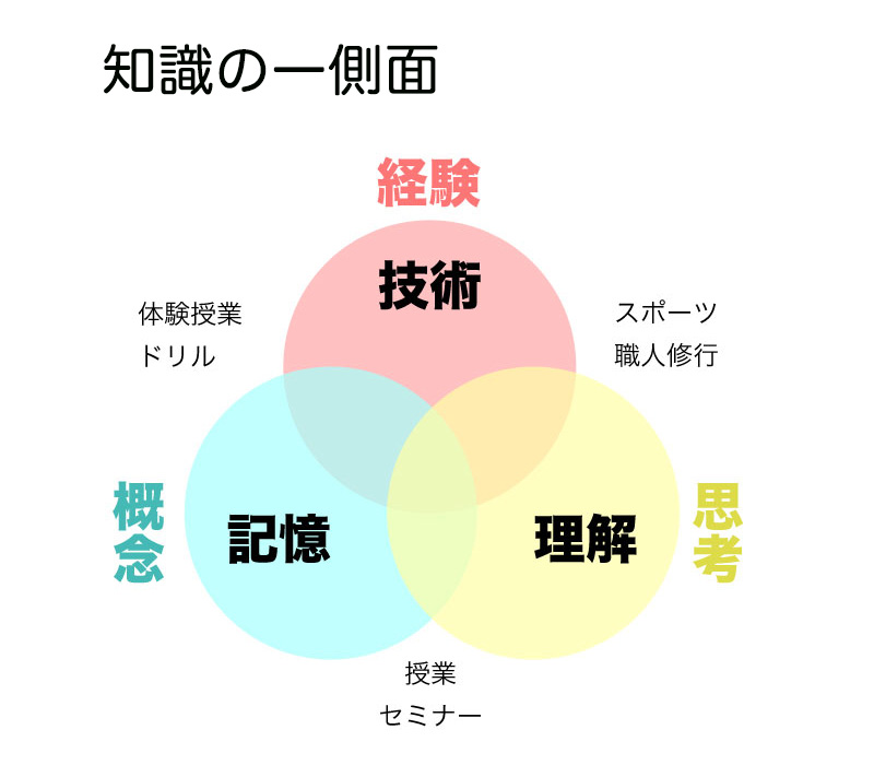 学校の講義はテキストを「記憶」したり「理解」する形式を取ります。座学ですね。これを繰り返し「経験」させるために、練習問題を解かせたりします。このようにしてバランスの取れた「知識」となります。
