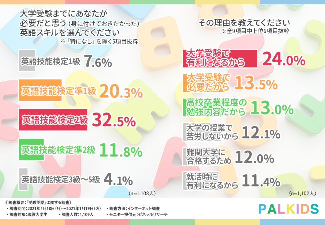 そんな彼らに「大学受験までに身につけておきたい英語力」を尋ねてみると、これまた予想通り。「英検準1級以上」を望んでいる学生が28%おり、その理由は「大学受験に有利」(24%)、「大学受験に必要」(13.5%)、「難関大学に合格する為に必要」(12%)だからとしています。