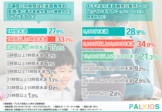 また、金銭的なコストに関しては、全体の85%が月額2万円未満のコストをかけているのに対して、15%は2万円以上、中には5万円以上も3%近くいることが分かりました。余談ですが、ここは「『パルキッズ』がいかにお安いか」噛み締めるところです。