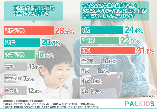 また、英語教育の目的を高校受験に据えているご家庭が28.5%で、英検2級を目指しているご家庭が31.1%と、これまた2.6%というわずかな差なので、高校受験が視野に入っているご家庭は英検2級を目標としているとも読み取れます。
