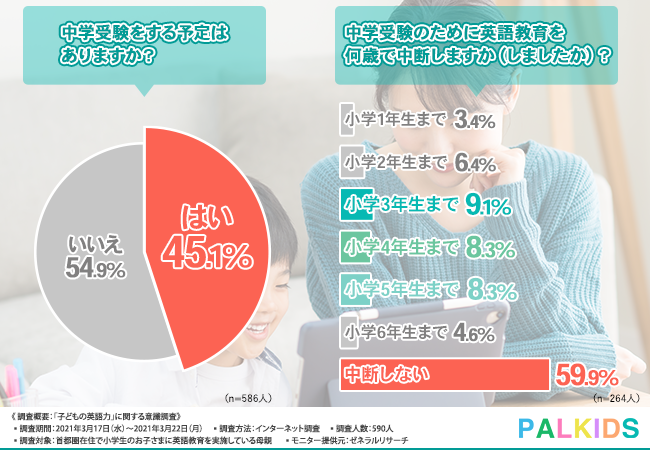 続いて「ある」と答えた方に限定して「中学受験のためにいつ英語教育を中断するか」を問うたところ、なんと6割が「中断しない」と答えたのです。「小学6年生で中断する」と答えた4.6%を合わせれば、64.5%で中学受験組のうち3人に2人までは「英語教育を中断しない」と答えています。