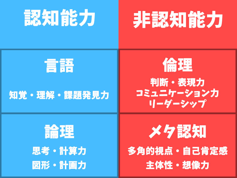 以降、認知能力の言語力(知覚力・理解力)並びに論理性と思考について、続いて非認知能力の倫理観とメタ認知能力の順に見ていくことにします。