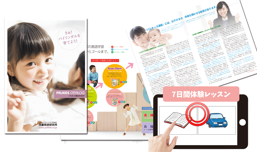 資料をご請求いただくと下記内容をお送りいたします。●「パルキッズ総合カタログ」●「7日間体験オンラインレッスン手引き」[特典]7日間体験オンラインレッスン[特典]オリジナルアルファベットソングお子様にぴったりの教材をお探しいただくのにご利用ください。また、資料をご覧になって、ご不明な点がございましたら「教材選びご購入掲示板」をご利用ください。24時間、教材選びのご相談を受け付けております。
